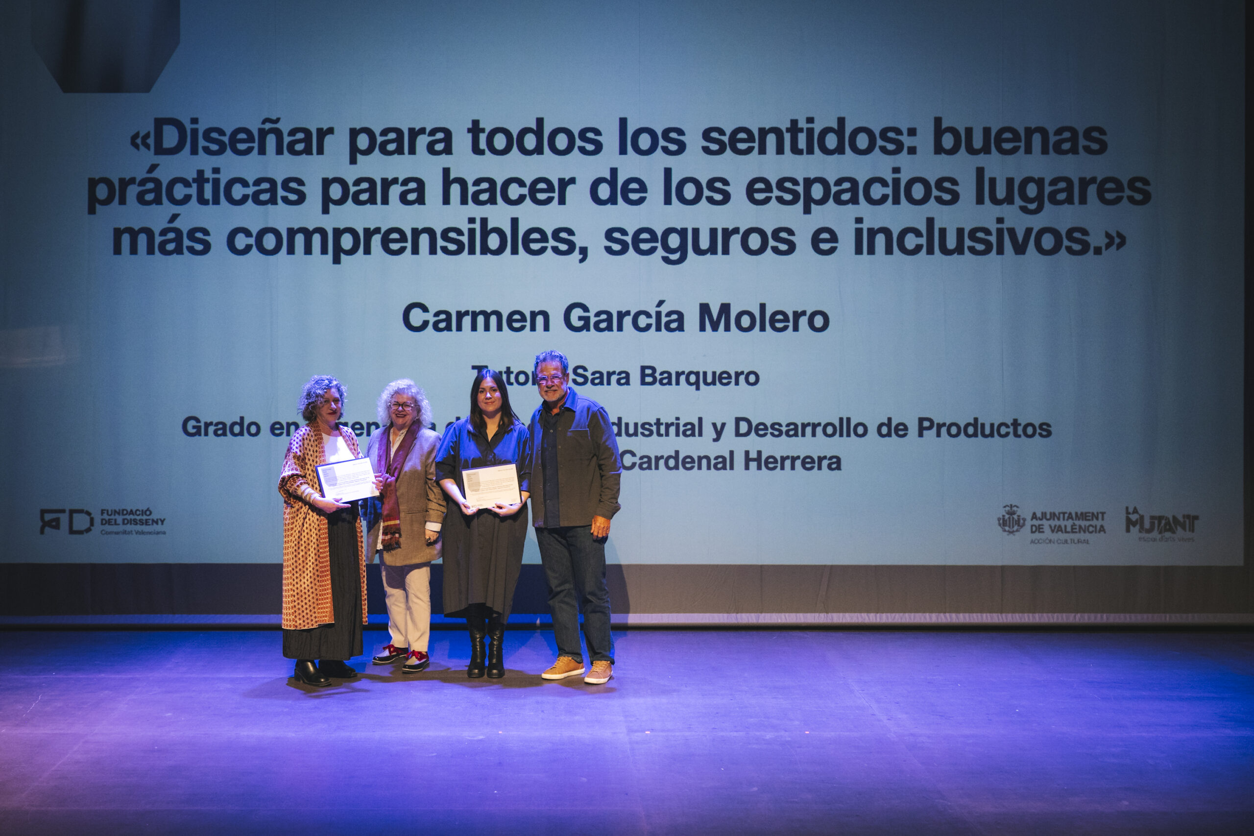 Este año ha sido distinguido el Trabajo Fin de Grado «Diseñar para todos los sentidos: buenas prácticas para hacer de los espacios lugares más comprensibles, seguros e inclusivos», de Carmen García Molero tutorizada por Sara Barquero (Escuela Superior de Enseñanzas Técnicas de la Universidad CEU Cardenal Herrera), un manual práctico de accesibilidad visual validado por profesionales y usuarios que integra recursos visuales, táctiles y sonoros desde la perspectiva del diseño universal.