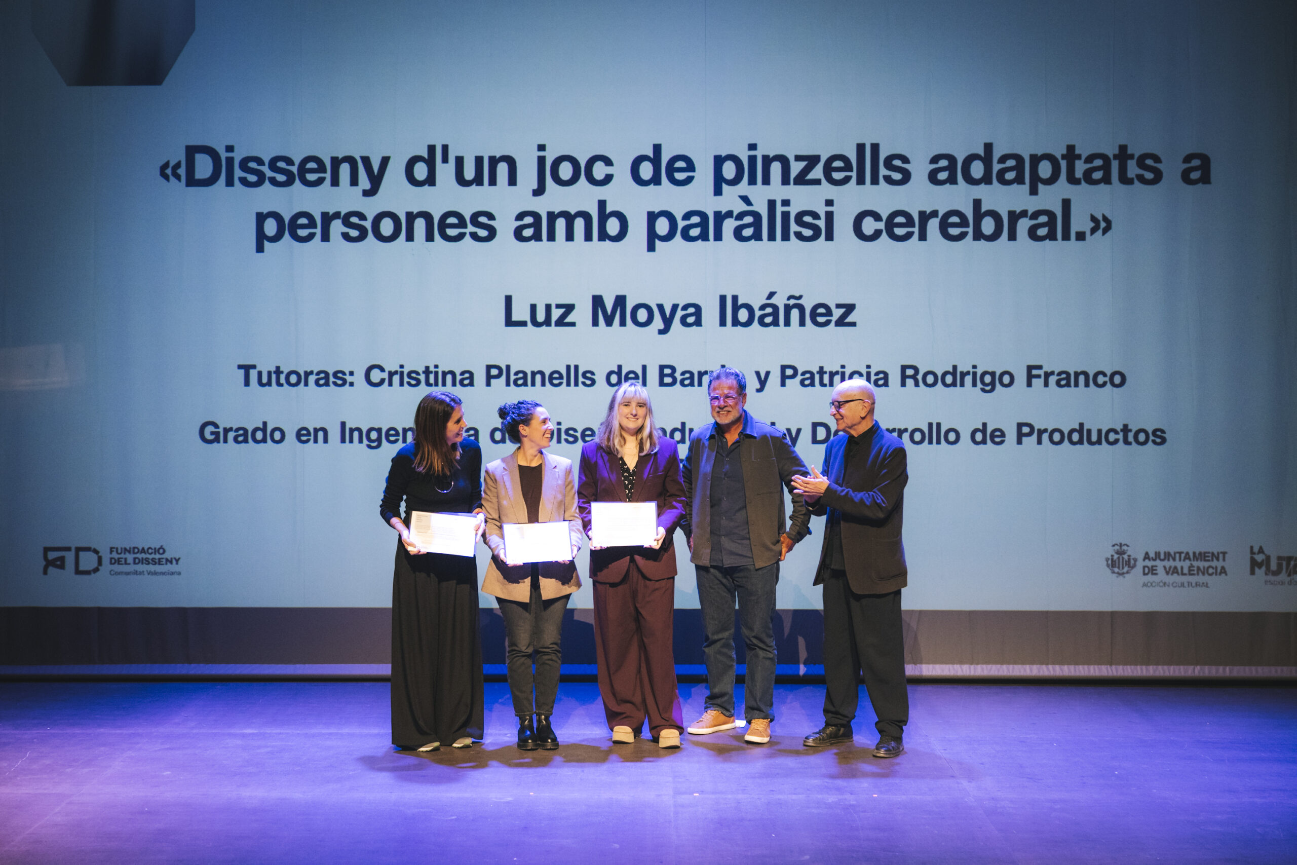 Asimismo, recibió también distinción el proyecto «Disseny d’un joc de pinzells adaptats a persones amb paràlisi cerebral», de Luz Moya Ibáñez (Escola Tècnica Superior d’Enginyeria Aeroespacial i Disseny Industrial de la Universitat Politècnica de València), un Trabajo Fin de Grado tutorizado por Cristina Planells del Barrio y Patricia Rodrigo Franco que se basa en el diseño de un sistema de pinceles que mejora la autonomía y la experiencia creativa de personas con parálisis cerebral, demostrando cómo el diseño de producto puede generar impacto social tangible desde la empatía y la investigación aplicada.