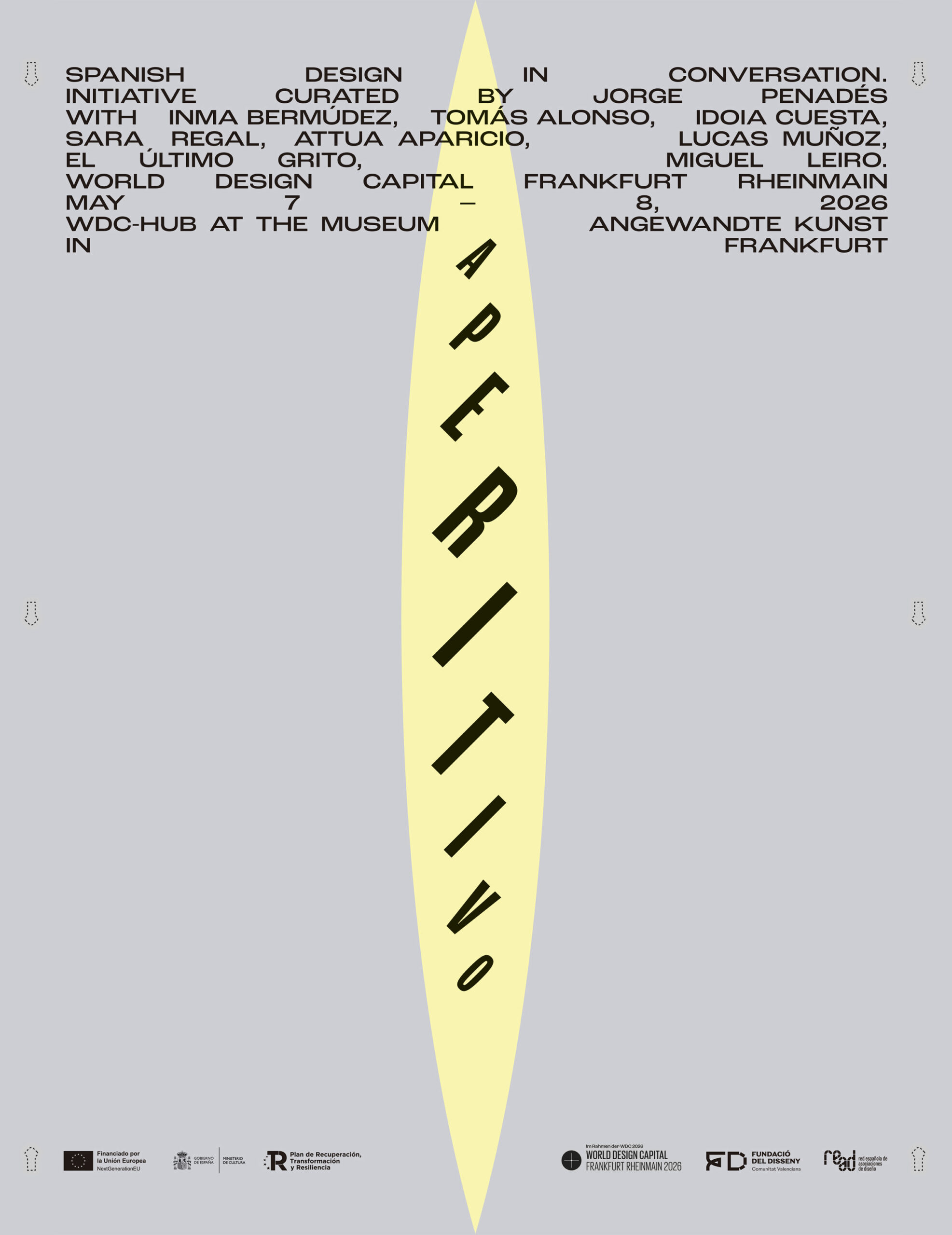 Comisariado por el diseñador Jorge Penadés, «Aperitivo» propone un formato innovador que se aleja de la exposición tradicional para plantear el diseño como espacio de encuentro. El diseñador malagueño, en su línea de investigación de objetos y espacios, ha abordado este proyecto como un reto sobre la reinterpretación de materiales y técnicas, con una instalación concebida específicamente para el espacio que se desvelará en el WDC-Hub (Museum Angewandte Kunst) de Frankfurt los días 7 y 8 de mayo de 2026, donde se desarrollarán las conversaciones abiertas con ocho destacados perfiles del diseño español: Inma Bermúdez, Tomás Alonso, Idoia Cuesta, Sara Regal, Attua Aparicio, Lucas Muñoz, El Último Grito y Miguel Leiro, quienes dialogarán en distintos bloques temáticos, generando un intercambio directo con profesionales del contexto alemán.